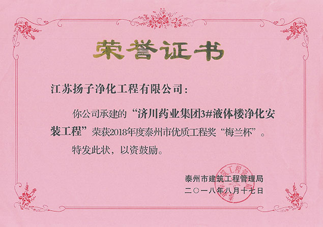 八月的天氣依舊火熱,公司的捷報頻傳。公司承建的“濟川藥業集團3#液體樓凈化安裝工程”榮獲2018年度泰州市優質工程獎“梅蘭杯”。該獎項由泰州市建筑工程管理局和泰州市建筑業協會聯合頒發,每年評選一次,是泰州市建筑工程質量最高榮譽獎。