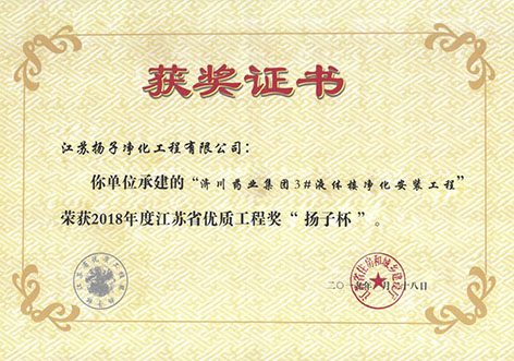 2019年1月28日,江蘇省住房和城鄉(xiāng)建設(shè)廳公示了2018年度江蘇省優(yōu)質(zhì)工程獎“揚子杯”獲獎項目名單,江蘇揚子凈化工程有限公司承建的“濟川藥業(yè)集團3#液體樓凈化安裝工程”,榮獲江蘇省“揚子杯”優(yōu)質(zhì)工程獎。